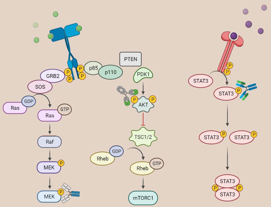 抗リン酸化特異的抗体(phospho-specific antibodies)は、特定のアミノ酸残基がリン酸化されている場合にのみタンパク質を認識する抗体であり、現代の生物医学研究において非常に発展しており、広く利用されているツールのひとつです。タンパク質のリン酸化は、重要な翻訳後修飾の一種であり、細胞内シグナル伝達経路の調節に深く関与しており、その結果、さまざまな細胞機能に影響を与えます。